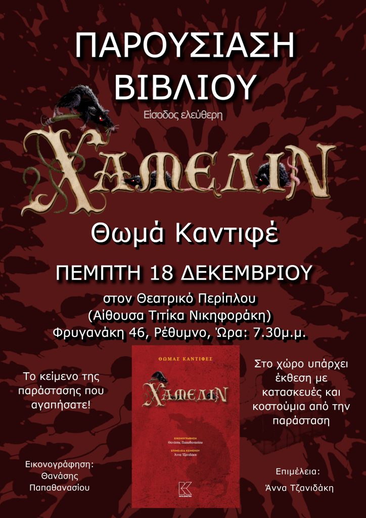 Το βιβλίο με το κείμενο του θεατρικού έργου “Χάμελιν” του Θωμά Καντιφέ κυκλοφορεί από την ΚΑΠΑ εκδοτική, με μια μοναδική εικονογράφηση από τον Θανάση Παπαθανασίου!